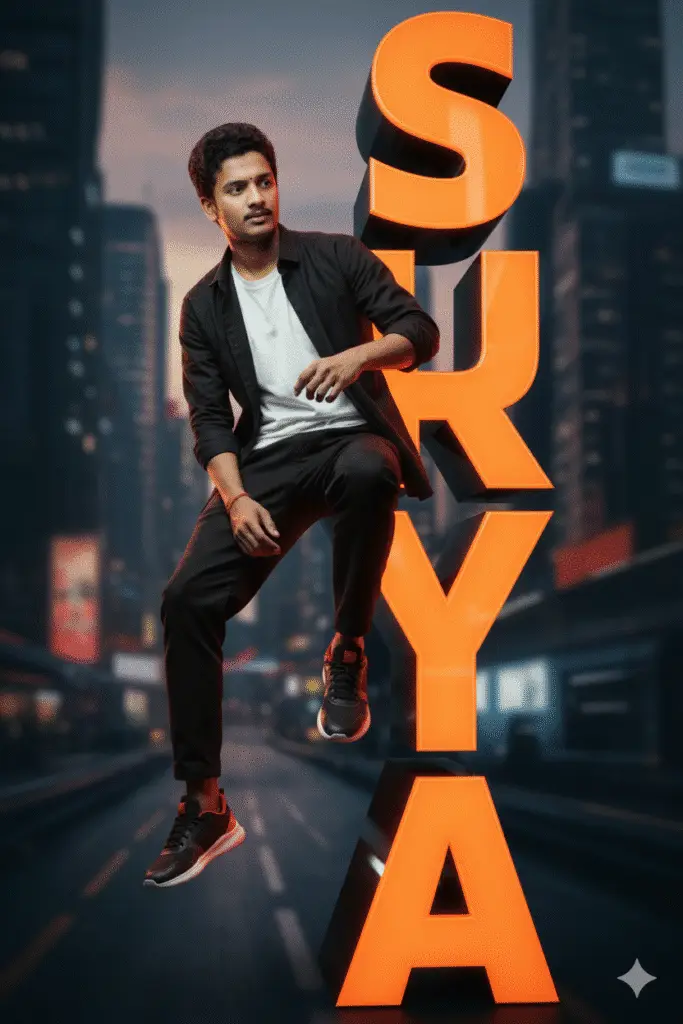 A stylish young man in casual black outfit sitting confidently on giant 3D glowing orange letters forming the name SURYA, futuristic city background with blurred neon lights, cinematic lighting, ultra-realistic, high detail, dramatic atmosphere."