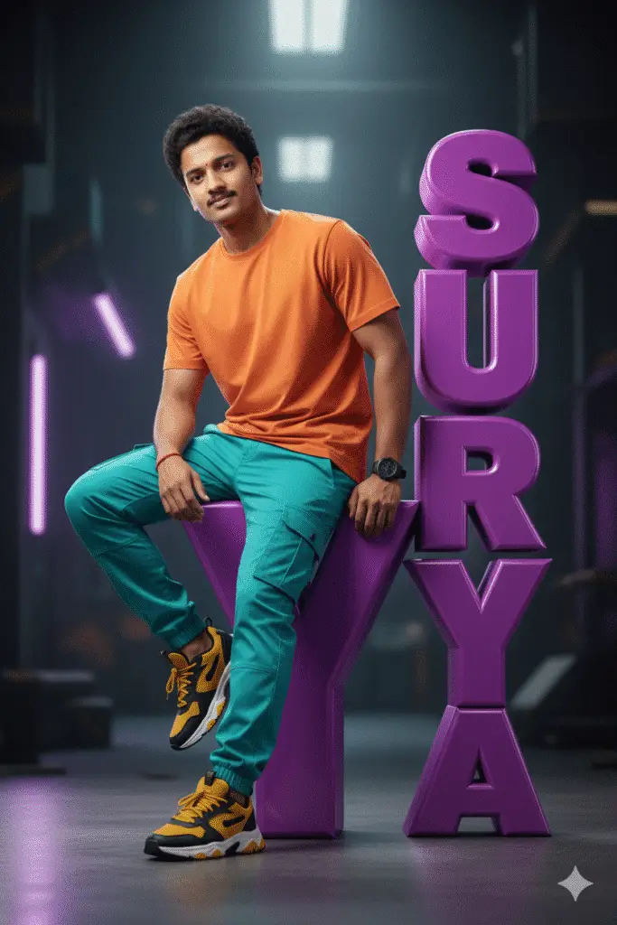 A young man in bright orange t-shirt and teal cargo pants sitting on giant 3D glossy purple letters forming the name SURYA, modern indoor futuristic environment with neon lights, studio lighting, ultra-realistic, high detail, vibrant and stylish atmosphere."